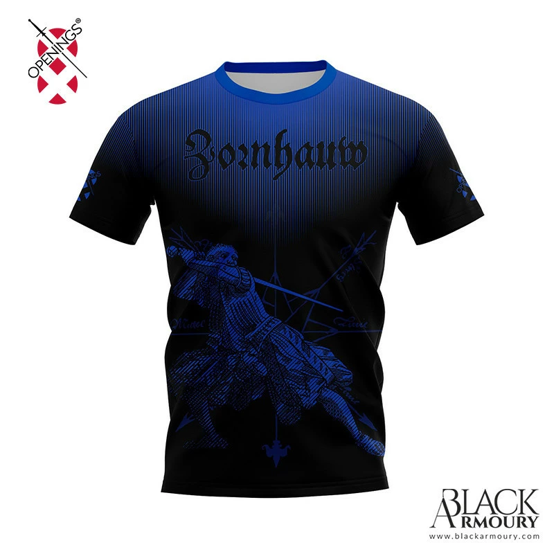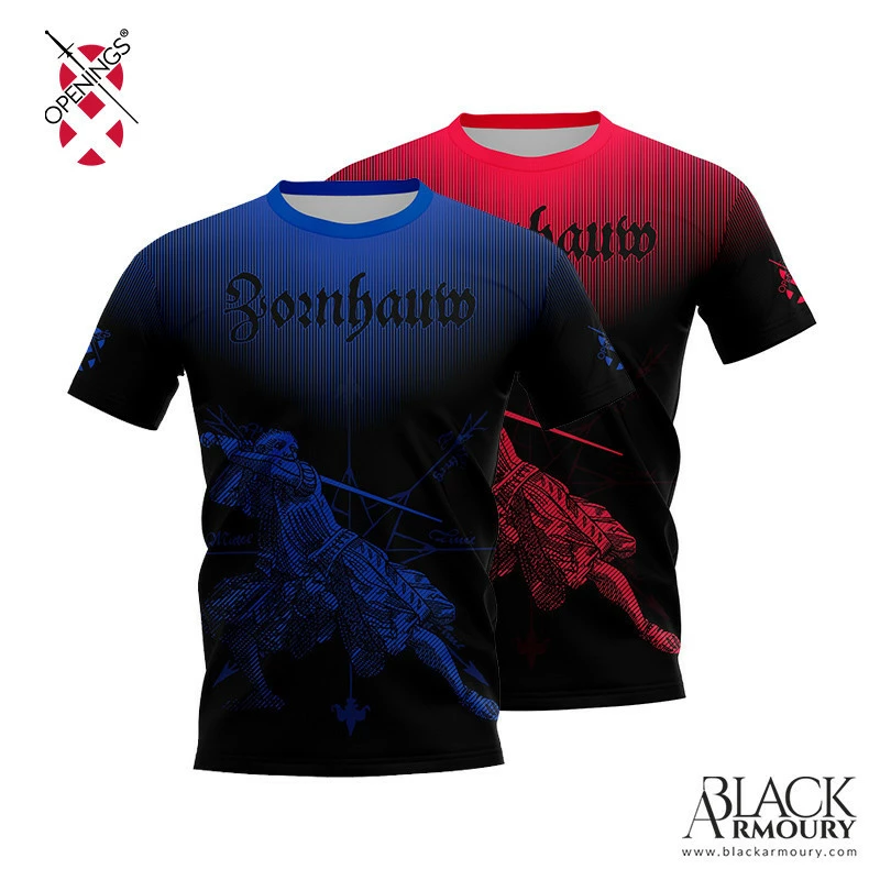 «Der Zornhauw ist ein schlimmer Hauw… und ist doch nichts anderes als ein schlichter Bauernschlag». Noir, rouge, agressif et menaçant et pas du tout retenu ou un bleu, royal, calme au combat… mais d’autant plus dangereux pour l’adversaire. Les images de l’épée longue et du dussack du livre d’escrime de Joachim Meyer se combinent avec le confort maximal.