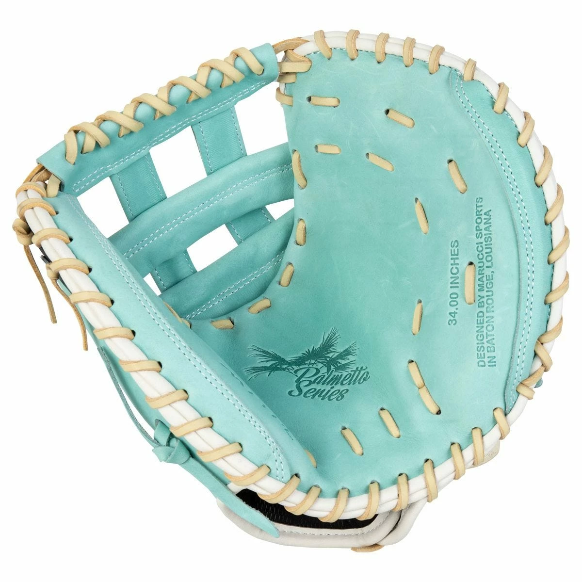 Introducing the 2023 Marucci Palmetto 34” Fastpitch Softball Catcher’s Mitt. The Palmetto series features a premium, tight grain steerhide leather shell and supple leather palm lining with added cushioning. To enhance the strength of the glove, Marucci has added professional-grade rawhide laces for durability to this series. Along with the premium leather on the Palmetto series, Marucci has included pro-style patterns that are specifically designed for fastpitch players. Tapered hand stalls provide players with a better fit and fielding control. For comfortability on the Palmetto series, Marucci has included a smooth microfiber wrist lining with high-density memory foam as well as their M Type fit. The M Type fit system provides integrated thumb and pinky sleeves with enhanced thumb stall cushioning to maximize comfort and feel. Take your game to a new level with the Marucci Palmetto series!