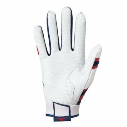 A popular batting glove that is power-packed with premium features. Made with embossed full grain leather palm to give players a combination of a great feel with increased durability. Designed with Mizuno AirMesh for maximum flex and breathability. Our quick adjust wrist tab gives players a secure fit. Made with a neoprene wristband with a PNP™ (Personalized Number Plate) to give players a customization option.