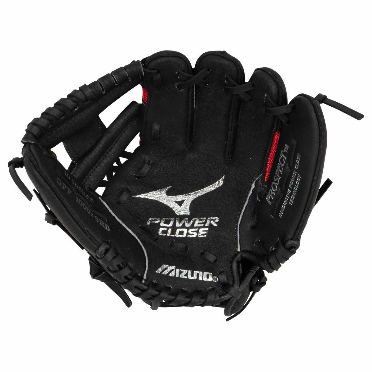 Additionally, the Mizuno Prospect Series PowerClose GPP1000Y3RD 10-inch Youth Baseball Glove is designed with a Parashock Palm Pad for outstanding protection and ideal comfort, and its PowerClose Technology makes catching easy for younger players. This glove features a Pro-I web style and a black/red colorway.